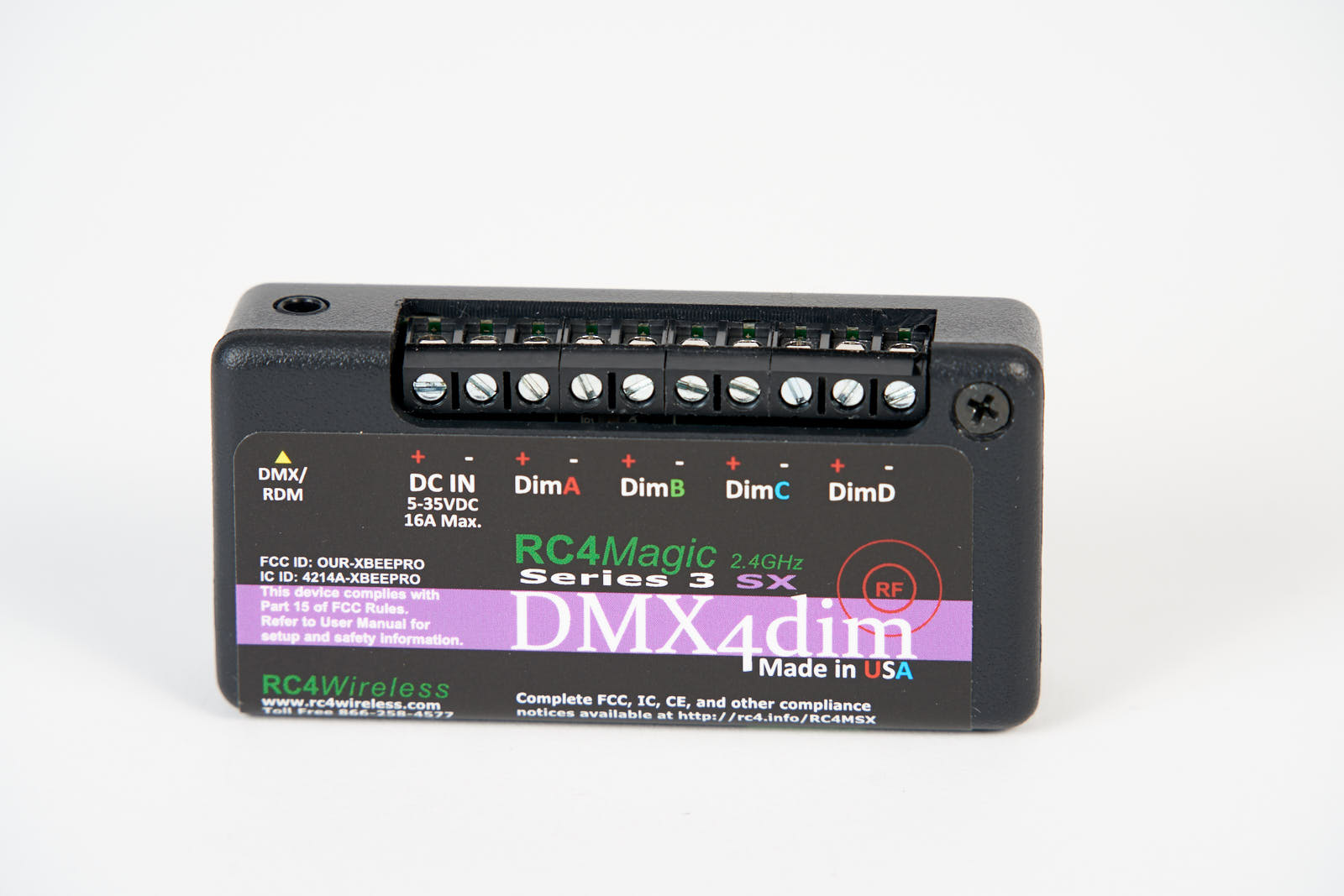 The RC4Magic S3 DMX4dim is a compact and powerful 4-channel wireless dimmer designed for professional lighting applications. This device allows for seamless integration into existing DMX systems, providing reliable and precise control over various lighting fixtures. With its robust wireless technology, the DMX4dim eliminates the need for cumbersome cables, offering greater flexibility and quicker setup times. It’s an ideal solution for theatrical productions, events, architectural lighting, and any scenario where wireless dimming control is essential.